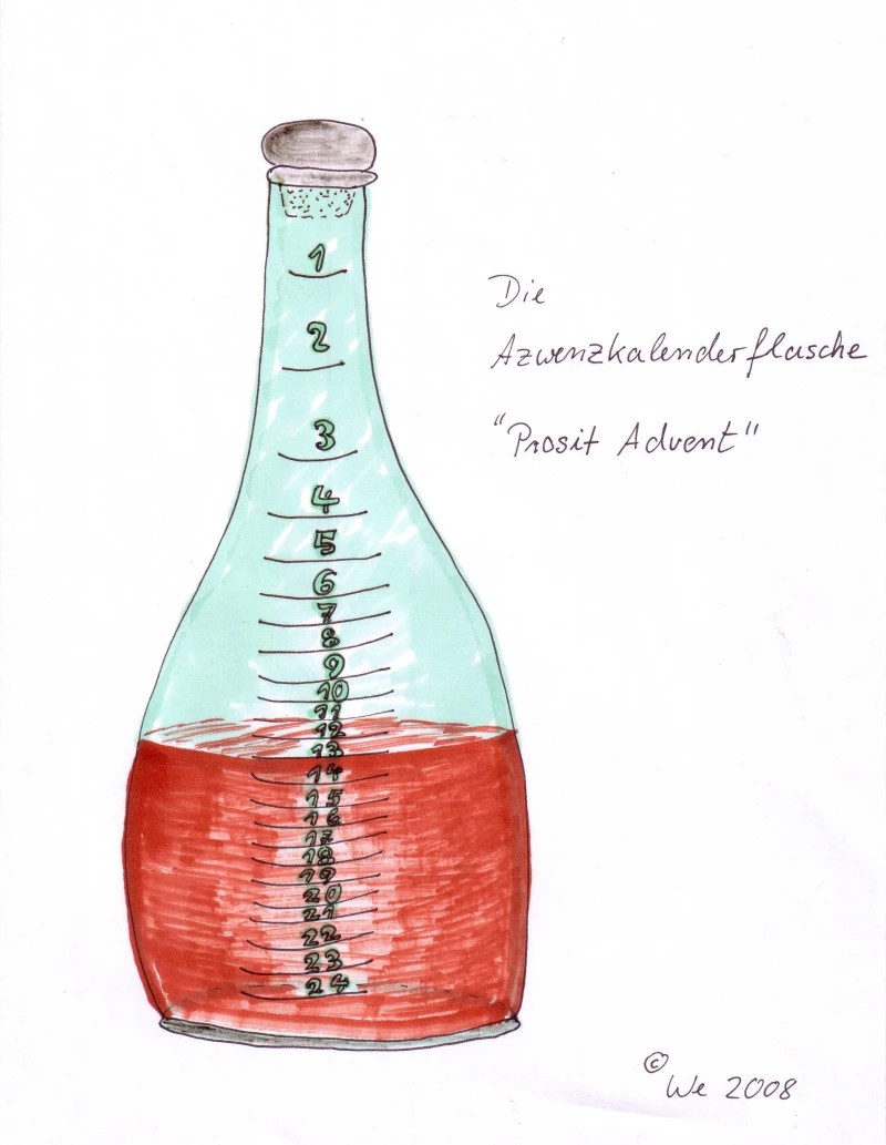 Zielstrebig immer einen Schluck trinken um exakt die Tagesmarkierung zu erwischen? Klappt bei mir nicht – dafür sehe ich viel zu wenig. Aber interessant. Erinnert mich an ein fast vergessenes Weißbierglas mit ähnlichen Markierungen.