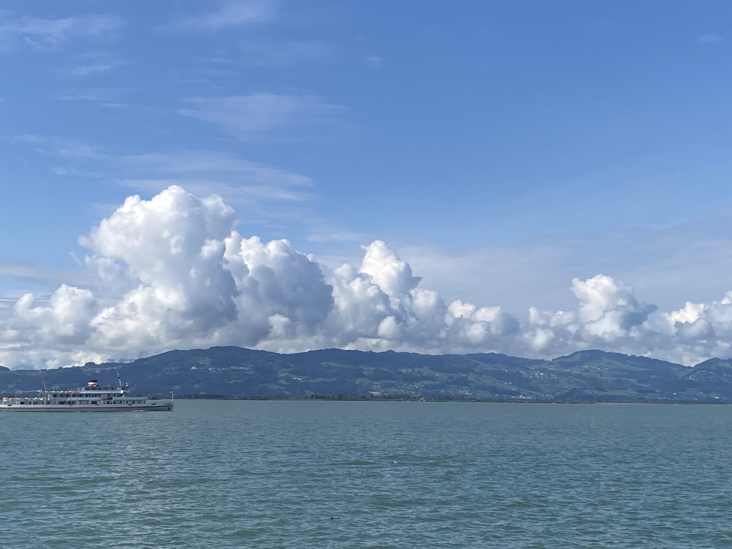 Müde! Darf ich das überhaupt schreiben? Ist das nicht wieder total langweilig? Interessiert‘s den großen Geist – unwichtig! Ich finde mein Foto schön. So wie die Wolken über den Schweizer Bergen stehen, weiße Wolken. Wie hoch mögen sie wohl sein? Bestimmt wolkenkratzergroß! Wie klein sehen sie aus der Ferne aus. Auch Sorgen sind klein, je weiter man weg ist. Meine waren am Bodensee solche Wolken…